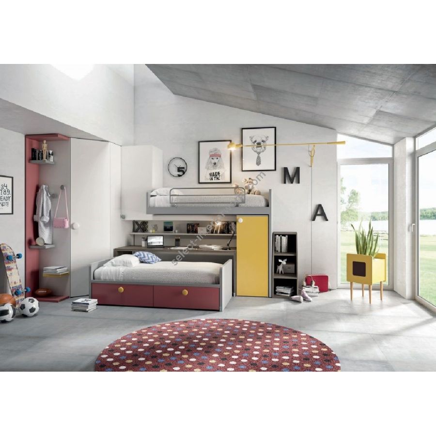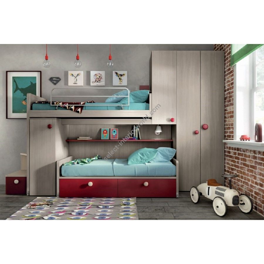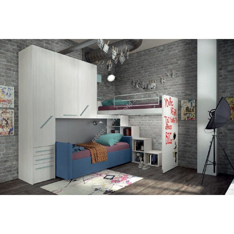 Two beds, a staircase, two or more wardrobe columns in the same wall with an easy movement.