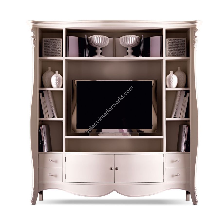 Eine raffinierte Kollektion, inspiriert von klassischen Mustern. Die für die Renaissance typischen Schnitzereien auf der massiven Holzstruktur sorgen für einen raffinierten und kostbaren Effekt. Das mit anmutigen Kurven gestaltete TV-Gerät mit Türen und offenen Räumen ist eine romantische und raffinierte Lösung für jedes Ess- oder Wohnzimmer.