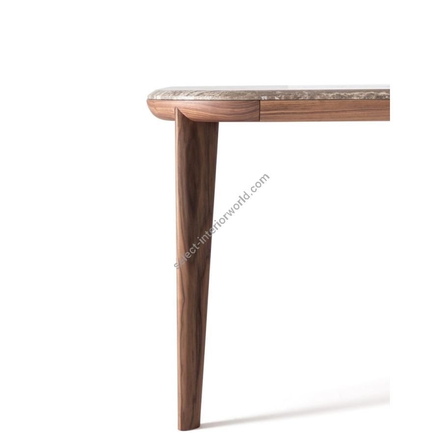 Jodie is a table that articulates the dialogue between substance and grace—where elemental forms unite with materially expressive surfaces. Its solid walnut legs flow seamlessly into the coordinating walnut top, establishing a visual equilibrium of quiet sophistication. The surface is equally available in marble, chosen from Ulivi Salotti's curated selection, introducing a dimension of enduring refinement.