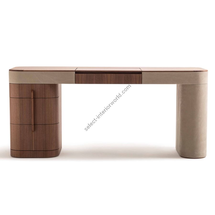 Lorinda is a vanity table that synthesizes design and utility through meticulous attention to detail. The walnut drawer unit, distinguished by integrated solid wood handles, is elevated with exclusive Ulivi Salotti leather insets. The wooden top, framed in solid walnut, completes the ensemble with visual coherence, while the central compartment—lined in leather and divided into organized sections—provides structured yet elegant storage. Lorinda achieves an ideal union of artisanal refinement and modern functionality.