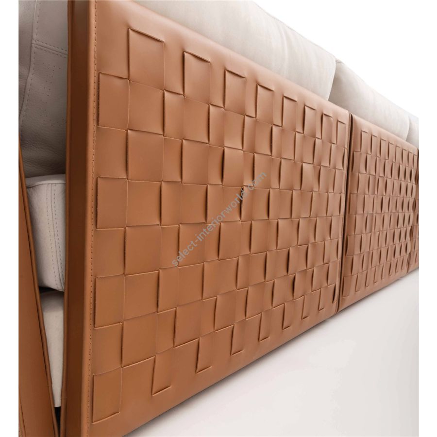 Boogie’s armrests and backrests, are upholstered with wide Tuscan leather strips, intertwined one by one by hand with extraordinary artisan details, which follow the shape of its firm and rounded bearing elements. The rounded volumes of the armrest and backrest make it comfortable at first glance, enriched by unique details that make it inimitable. The Boogie project also comes in its sectional version, thanks to its great flexibility in both dimensions and composition options. The sturdy, yet precious, leather upholstery of its structure blends brilliantly with the softness of its cushions. Moreover, by choosing the type of wood and metal finishes for the armrests and backrests structure, you have all the tools to design an even more unique sofa, perfectly tailored on your taste and preferences. Supported by a leather-covered wooden structure, the solid wood parts stand out with our exclusive finishes and wood options. The Boogie’s armrests are a true masterpiece: hand-woven leather adds a touch of artisanal elegance that enhances the quality and uniqueness of the sofa.