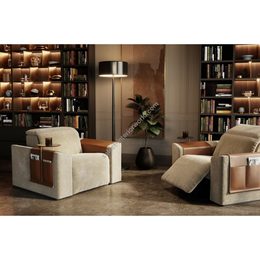 Kubrik reclining armchair is modular, and therefore configurable in different compositions. Furthermore, the wide choice of available covering materials makes Kubrik highly customizable: velvets, woven fabrics, leather, Nubuck, suede microfibres. It is possible to choose whether to equip the Kubrik armchair with a double mechanism, single or without reclining.
