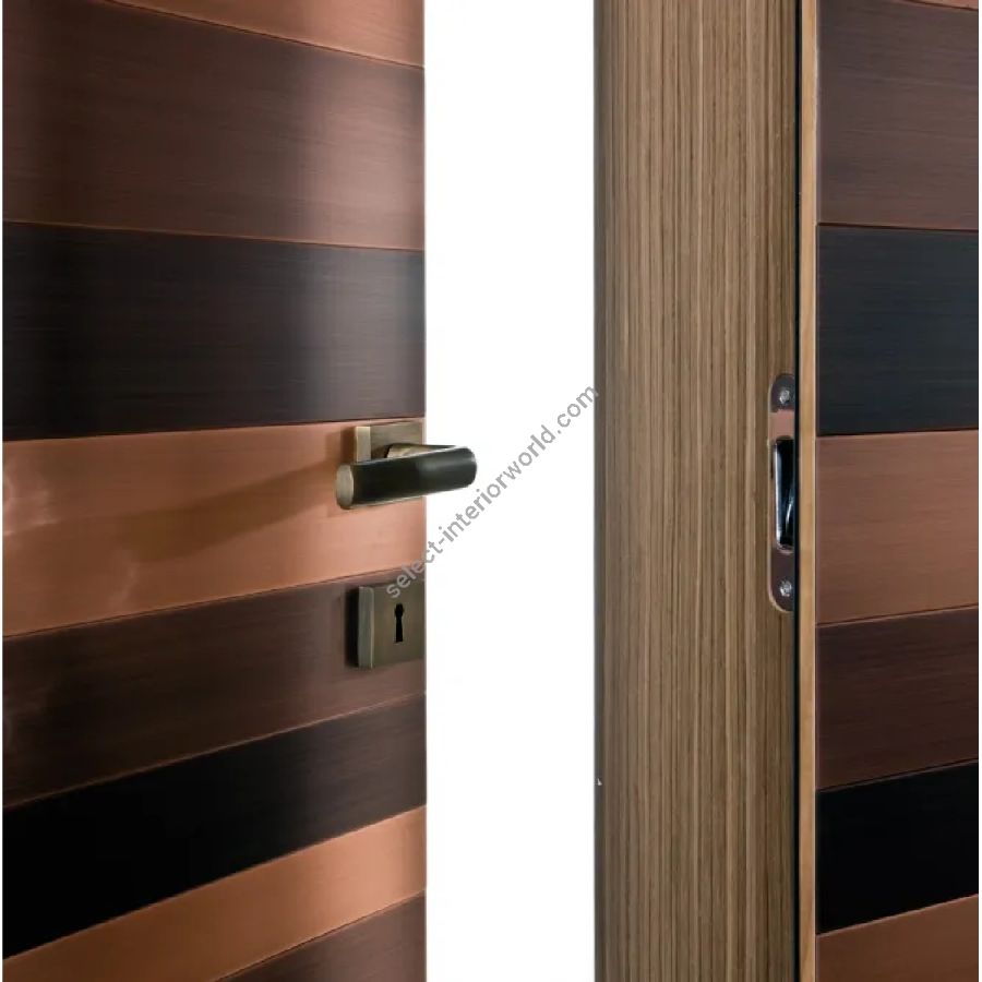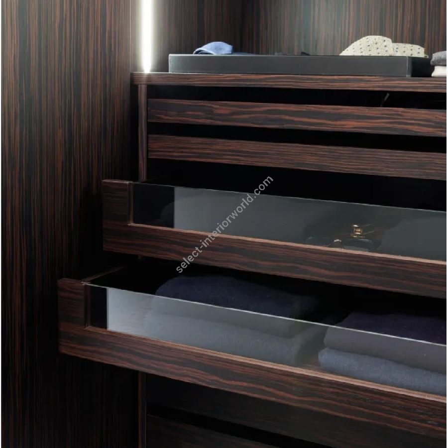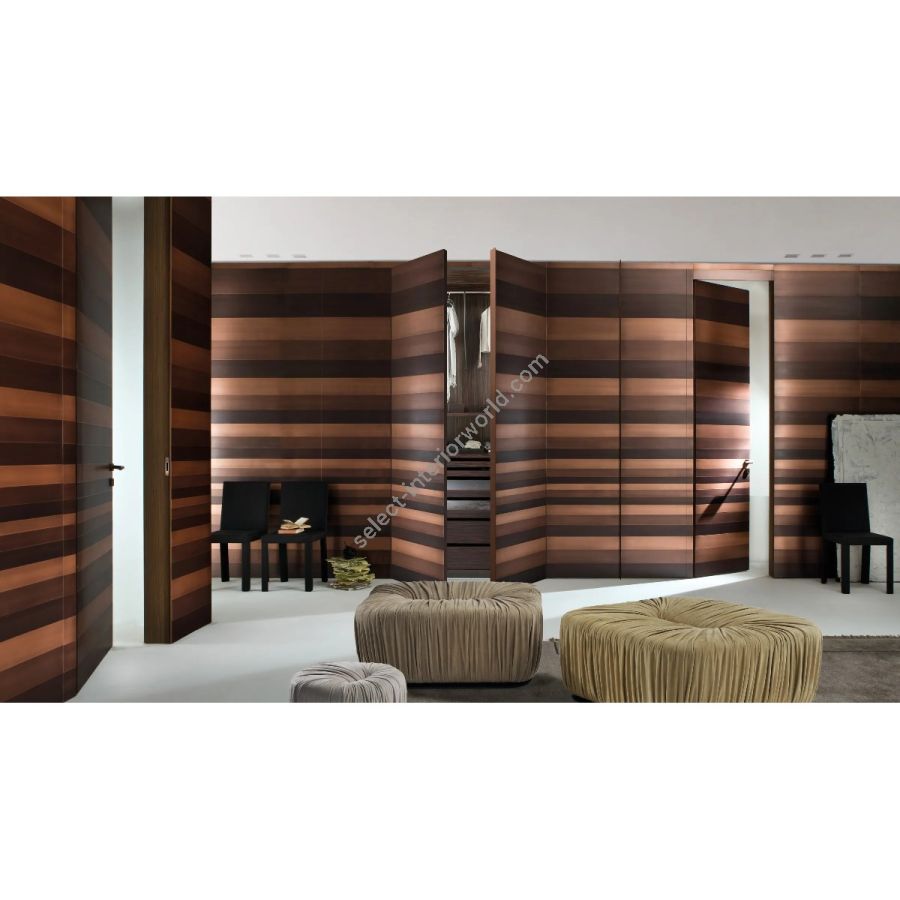 Made to measure wardrobe system clad in a sequence of metal bands, customizable in size and finishes. Available tailor-made with customizable accessories, equipment and internal finishes, and with integrated LED lighting.