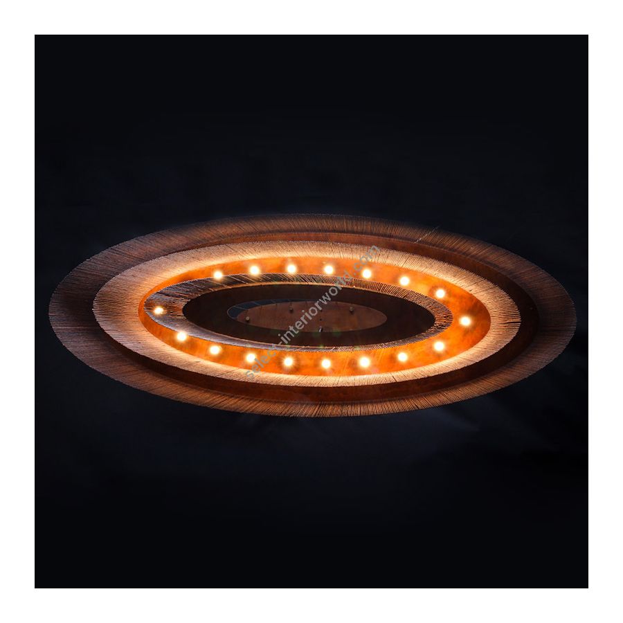 A ceiling mounted chandelier based on a modern classic chandelier design, an arrangement of three semi-transparent elliptical volumes. Illuminated by 18 surface mounted G9 Halogen or LED lamps.