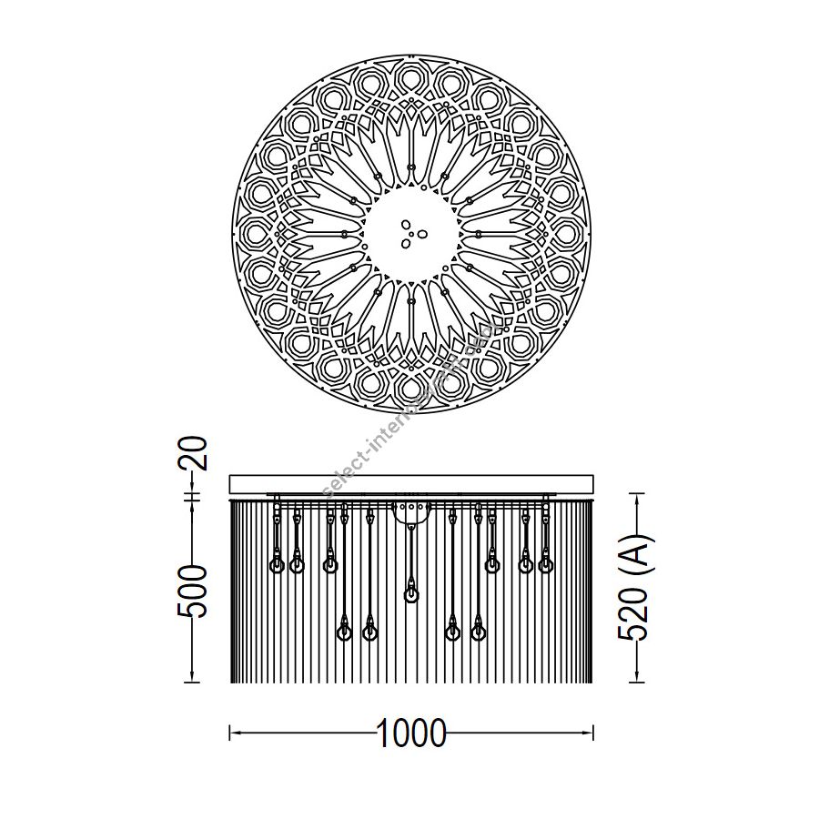 A ceiling mounted circular drum shaped chandelier inspired by Venetian wrought ironwork. Illuminated by a suspended arrangement of 19 pyrex glass balls containing G4 Halogen or LED lamps.