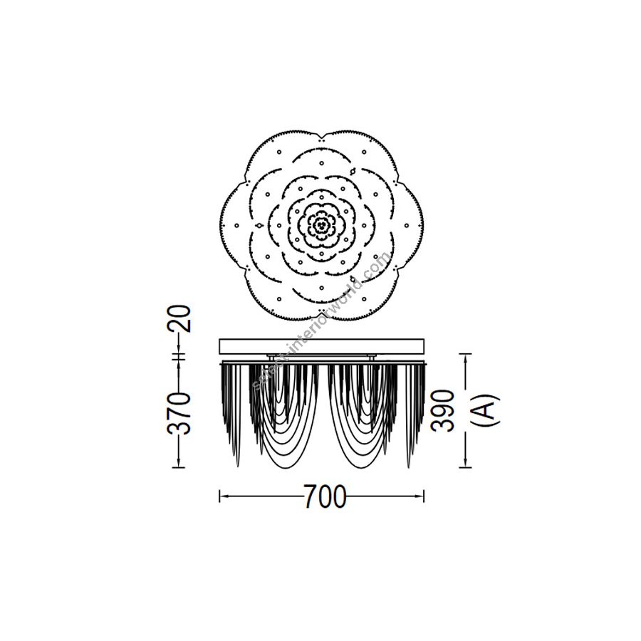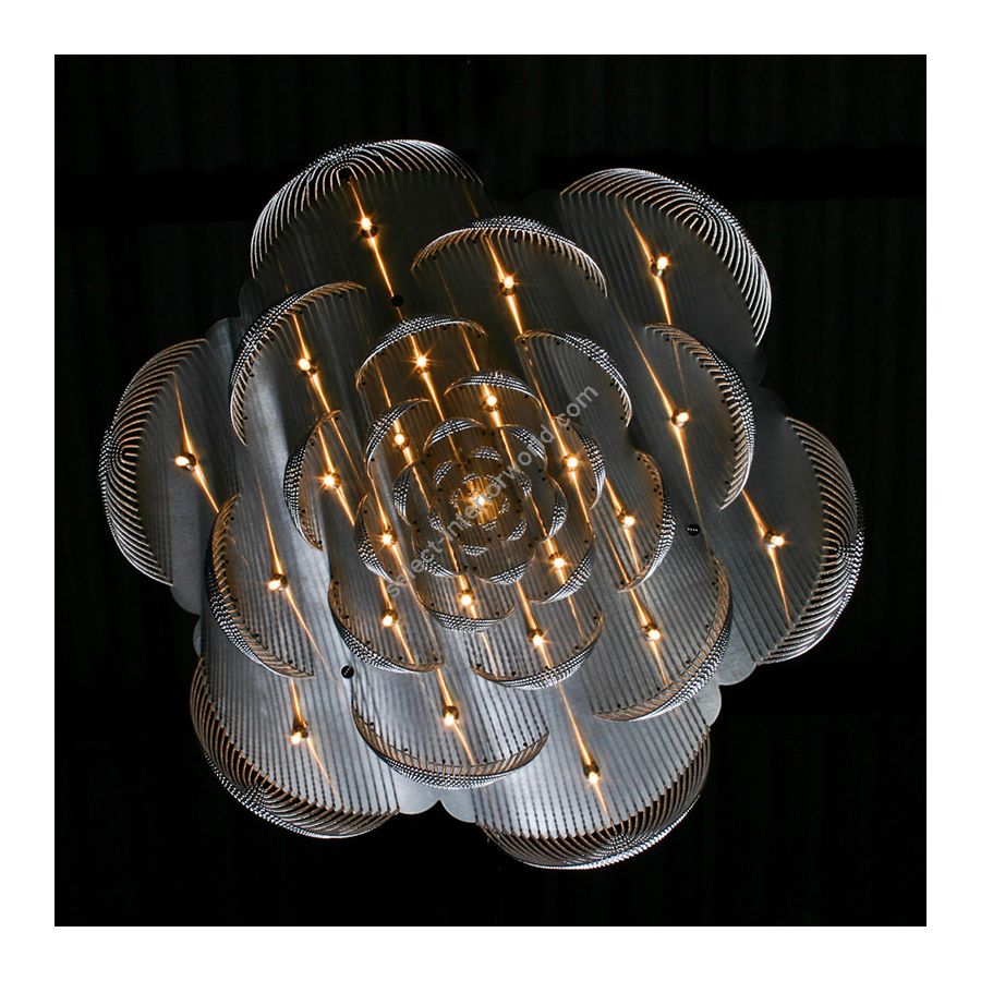 A suspended Hi-Tech plate chandelier with chain curtains as `petals` arranged in a layered formation in the shape of a Rose. Available in two optional styles `straight` or `looped`. Available in G4-Halogen or LED