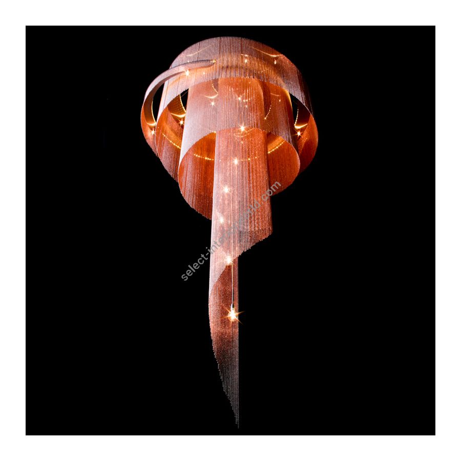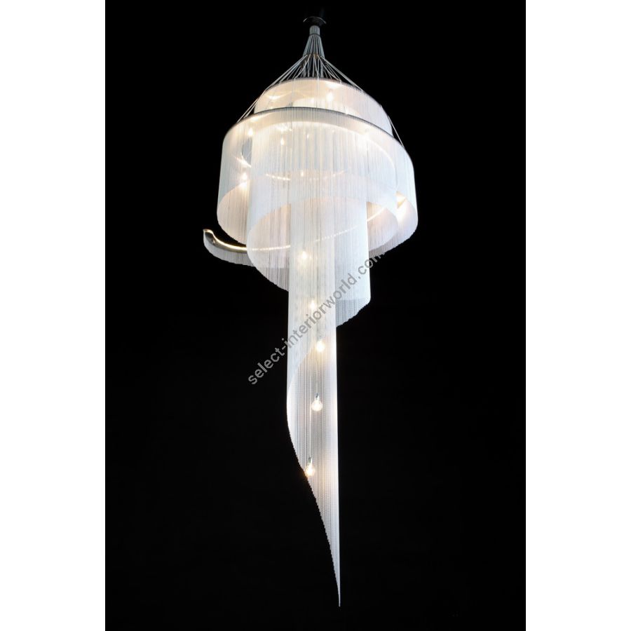 A Spiralling art-chandelier inspired by a holographic image of a cone shell. Illuminated by 3 electrical systems. Two are G4-Halogen or LED based and the other is a 5m long LED striplight. Ideal for a large volume space or a stairwell.
