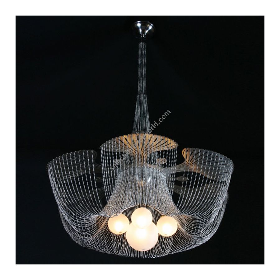 A chandelier design based on the form of the Moonflower. Illuminated by suspended cluster arrangement of 5 pyrex glass balls containing G9-Halogen or LED lamps.