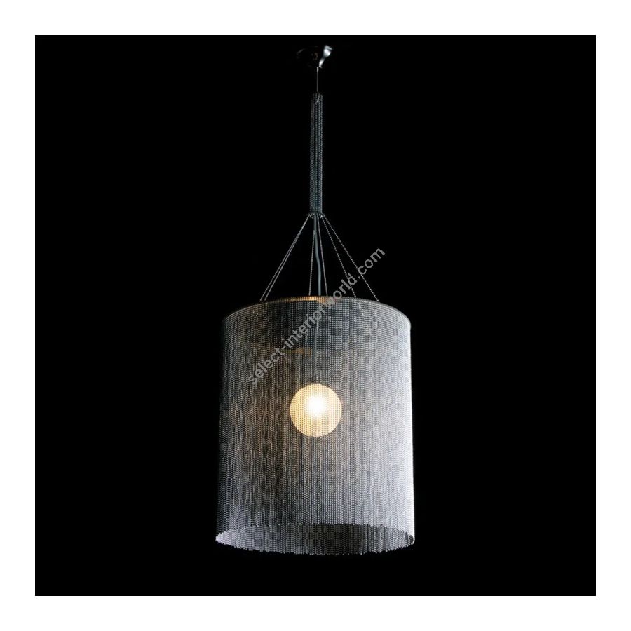 Simple classic `circular-cropped` pendant lamp. Illuminated by a pyrex glass ball containing a G9-Halogen or LED lamp.