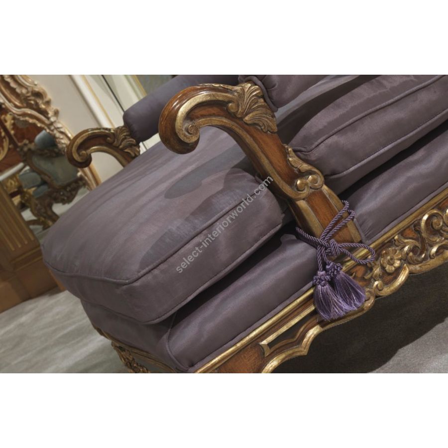 Wooden armchair with carvings and gold-colored details in classic style with internal backrest, seat cushions and decorative pads.