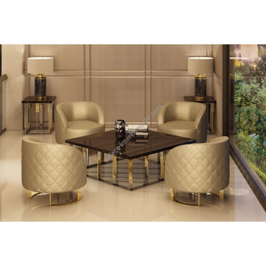 CALLA is a particular and enveloping modern armchair. The rounded shape of this armchair and its precious Champagne finishings give it a glamorous look suitable for a modern, contemporary living room or a bedroom. This armchair, with its refined character, fills every room with charm and elegance.