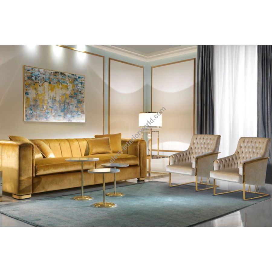 Elegant armchair in contemporary style embellished with a gold bath finish and capitonné upholstery.