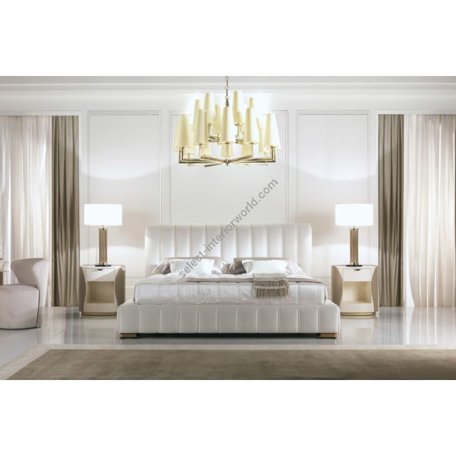 Elegant bed with embroidered decorations on the headboard and bed frame. Its handcrafted workmanship according to the Brianza tradition gives this complement a unique and personal touch that makes its beauty timeless and classic forever.