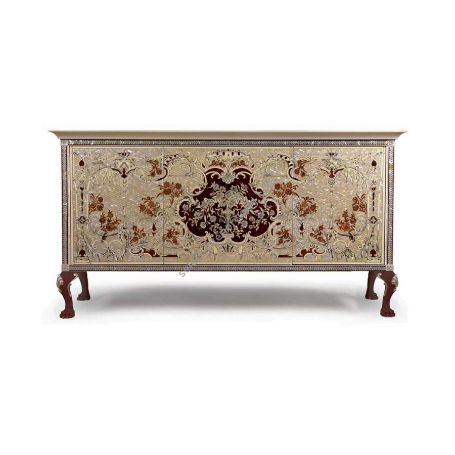 Classic style sideboard inlaid with 16,000 pieces of Australian mother of pearl, details in aliothis mother of pearl, avoriolina, French thuja burl, flowers carved in yew, cypress, boxwood and pao marfin.