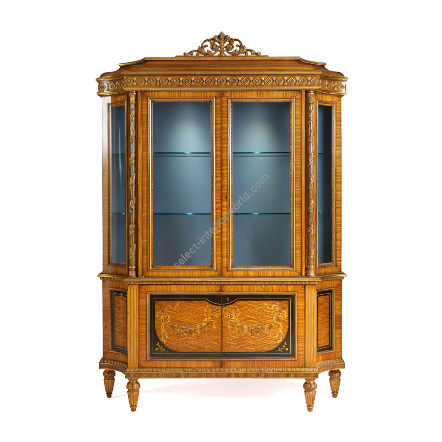 Classic style display cabinet with two doors. B/5142 is in citronnier and ebony. Its structure is inlaid with mother-of-pearl details and is complete with internal lighting. Its handcrafted workmanship according to the Brianza tradition gives this complement a unique and personal touch that makes its beauty timeless and classic forever.