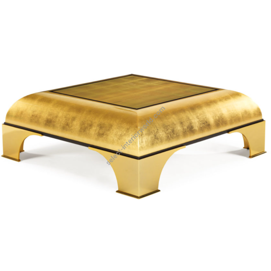Elegant central coffee table with brass feet and wooden top decorated with gold leaf.