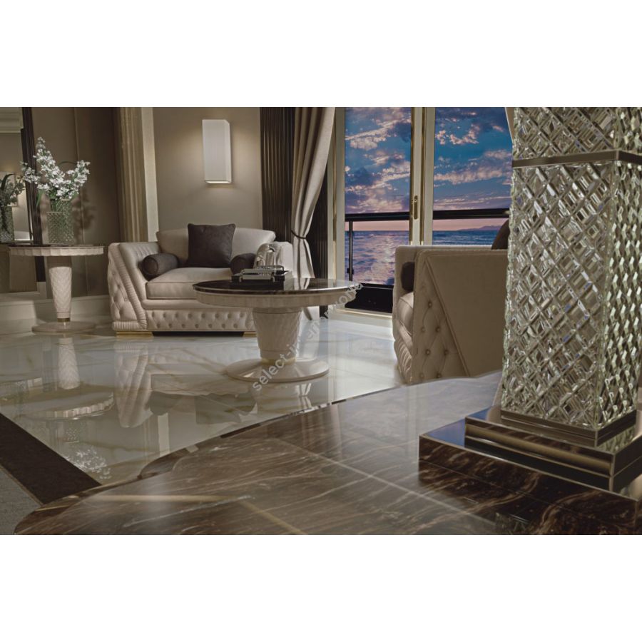 Pair of coffee tables with marble top and decorative elements in embroidered leather. Their pleasant design is the result of careful research that resulted in a harmonious union between present and past, tradition and innovation. Their apparent simplicity hides their great design complexity. Their style represents a vision: the art of living through furniture and accessories in which design, style, material, new workmanship and tailoring create new aesthetic codes.