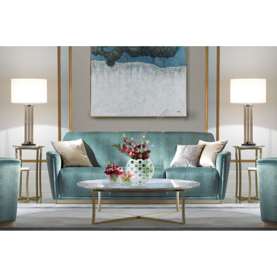Set of contemporary style coffee tables featuring a precious satin brass structure and an elegant circular marble top. The set consists of T163/C central table measuring cm. Ø 120 x h. 35, a high side table measuring cm. Ø 40 x h. 63 and a lower side table measuring cm. Ø 40 x h. 43