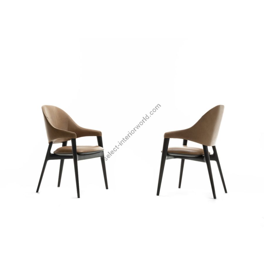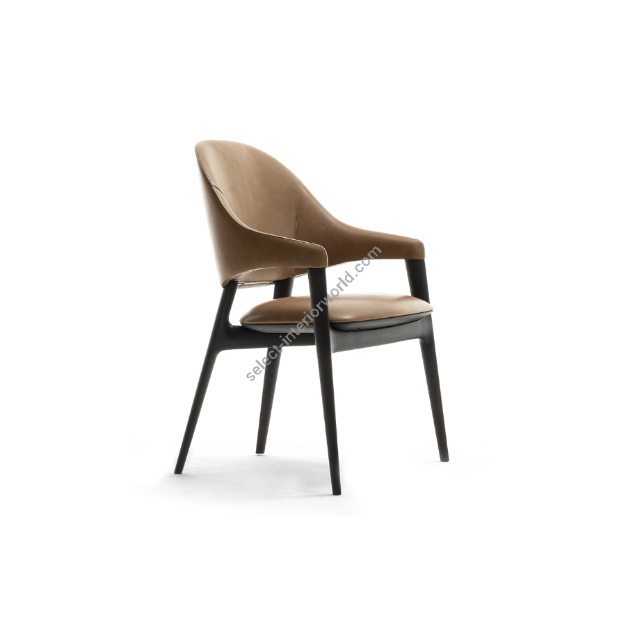 EGLE is an iconic chair from the modern collection with clean and harmonious lines obtained through the perfect combination of the solid wood structure with backrest, armrests and seat covered in leather. The light and dynamic design makes it suitable to be combined with tables and environments that belong to different styles and worlds.
