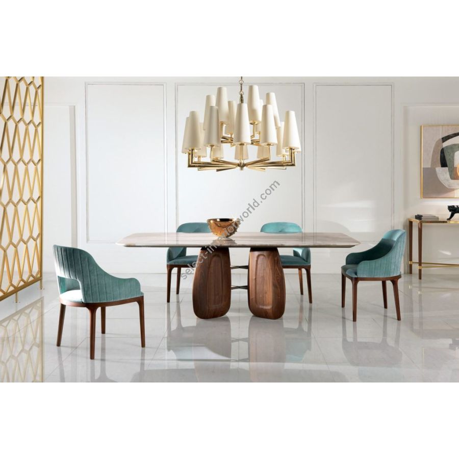 MARIPOSA is a distinctive design dining table in matt canaletto walnut with a marble top. The play of masses, expressed by the solid sculptural presence of MARIPOSA's legs, contrasts with the elegance of its marble top.