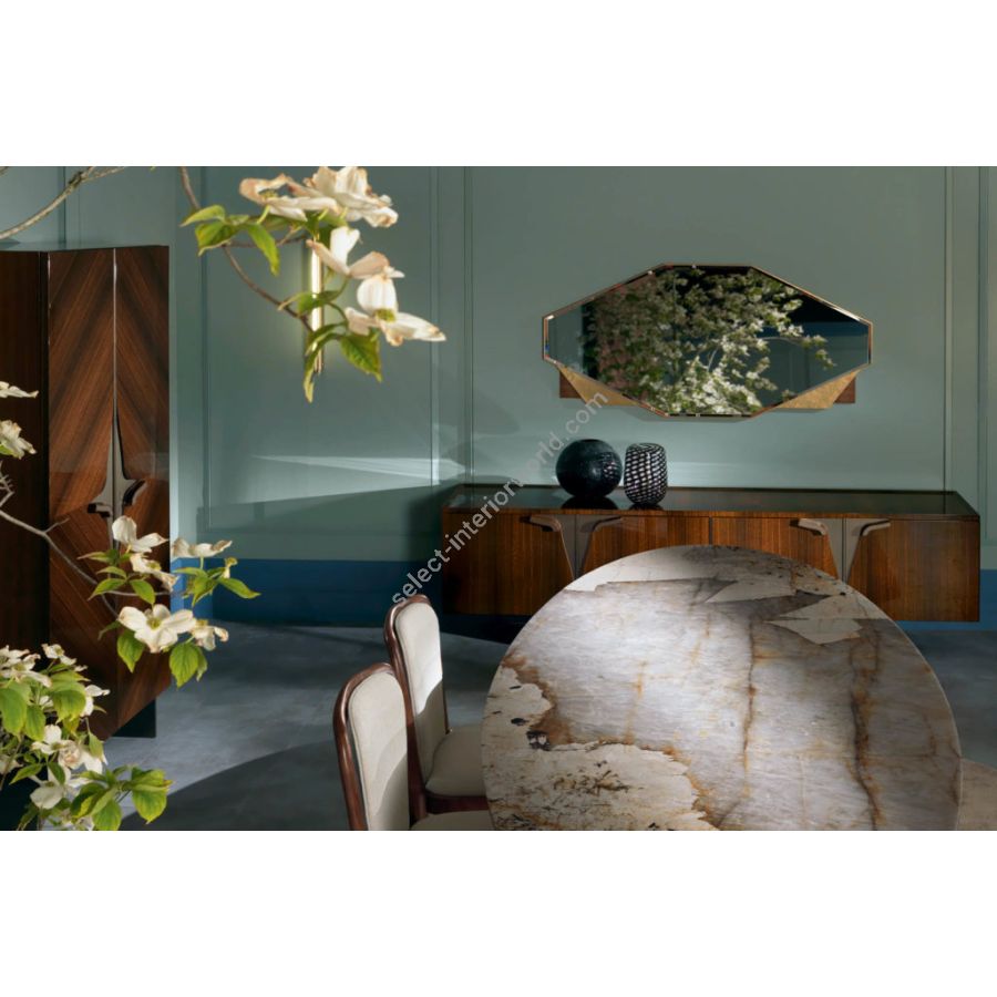 PLAYGROUND is an elegant marble dining table with a wooden base and a plexiglass element. Its liquid metal finish, accompanied by the transparency of the plexiglass reflects the brightness giving a touch of modernity and originality to the entire context.