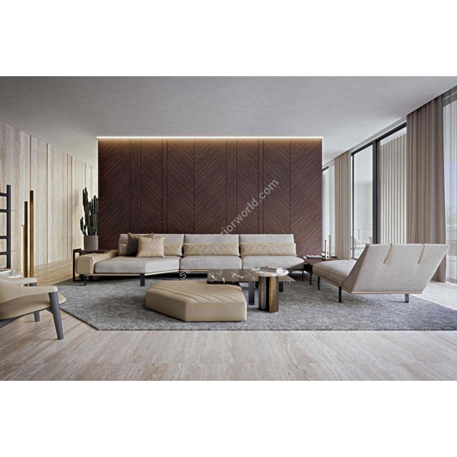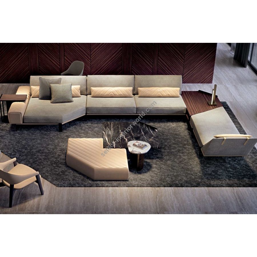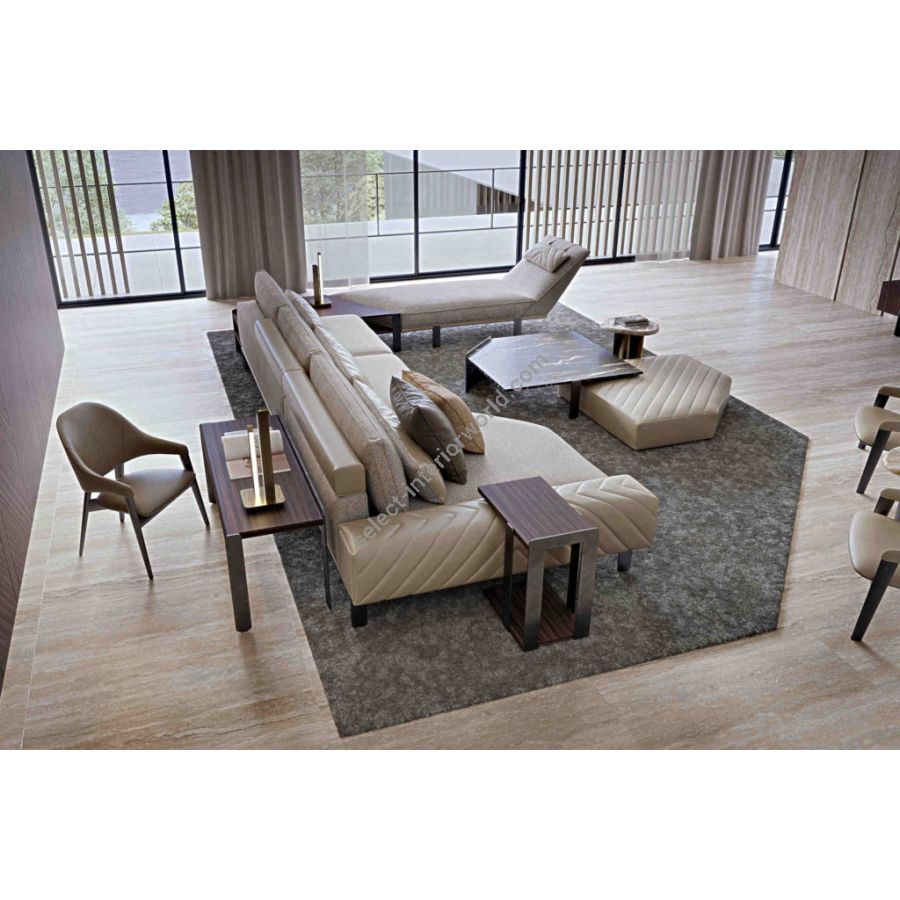 FREDDY is a modern style sofa characterized by an elegant combination of leather and fabric elements. Available in a fixed or modular version, FREDDY is an iconic sofa full of details such as the quilting repeated in the armrest and in the backrests.