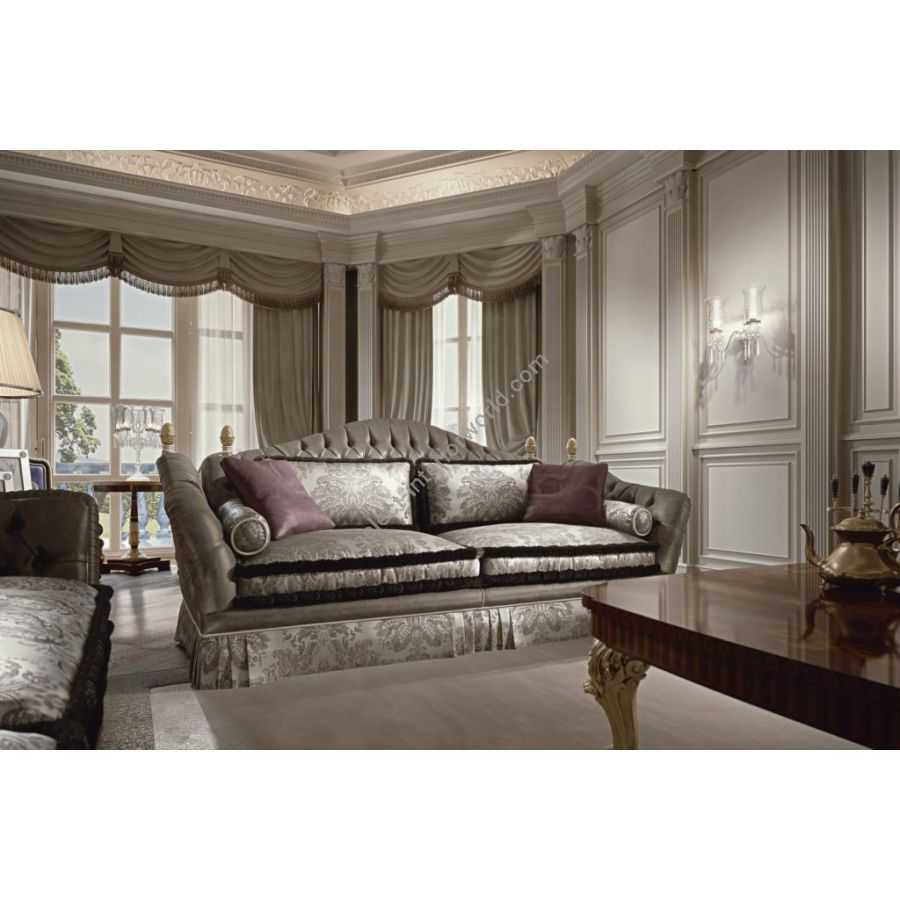 This is an elegant sofa with capitonné padding with a solid wood frame and non-deformable polyurethane foam padding with differentiated density. The LARA sofa is embellished with gold details and decorative cushions covered in damask fabric with feather padding.
