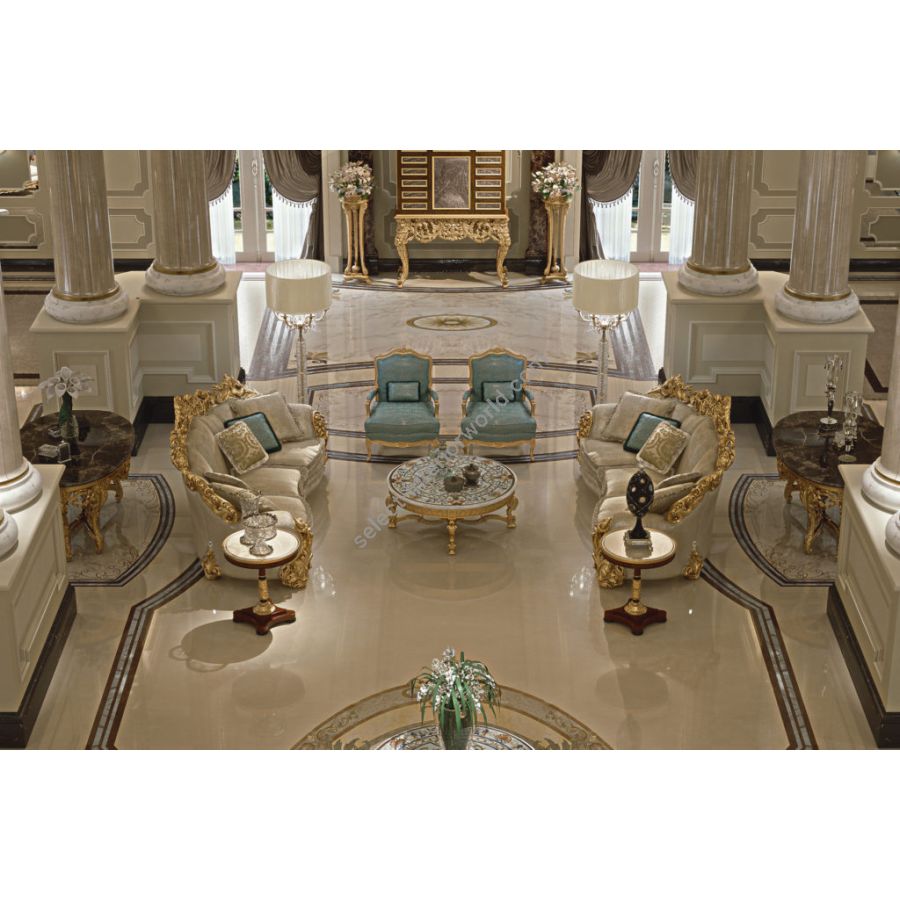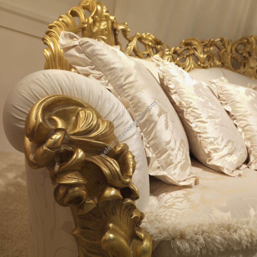 The LEONARDO living room: armchair and sofa, is the ZANABONI proposal of baroque inspiration . The distinctive elements of this style are the shape and the decorations carved in wood embellished by the gold leaf finish which has been given thickness through the use of the ivory patina. Its style represents a vision: the art of living through furniture and accessories in which design, style, material, new workmanship and tailoring create new aesthetic codes.