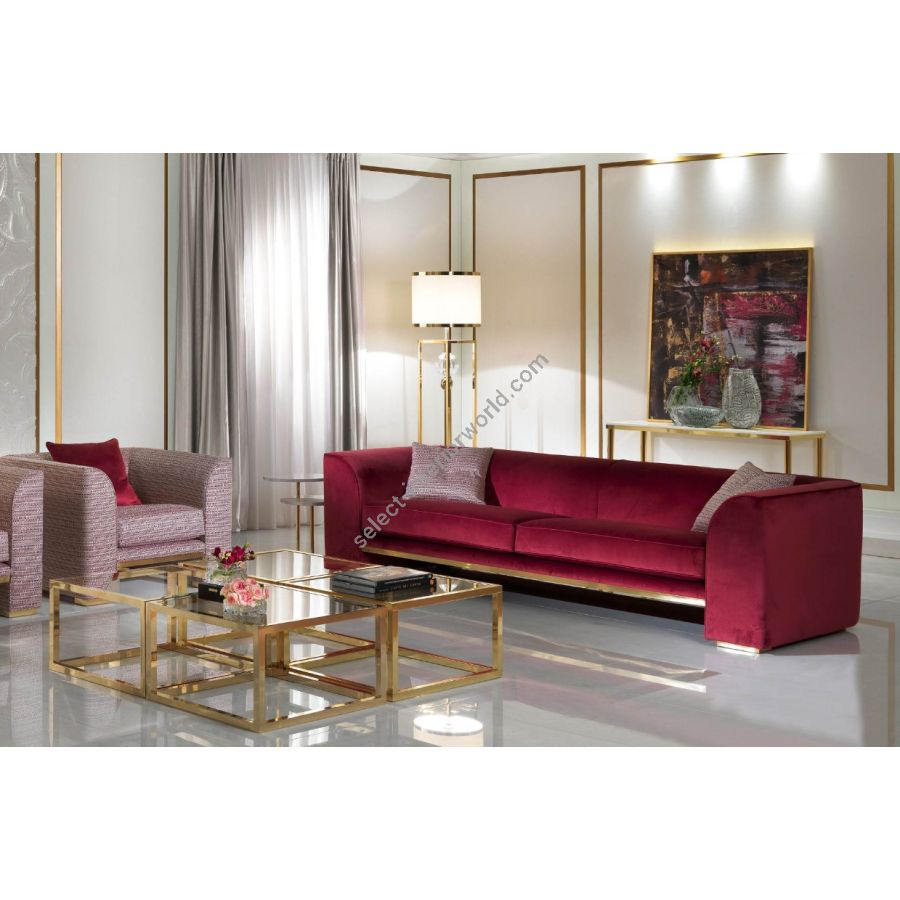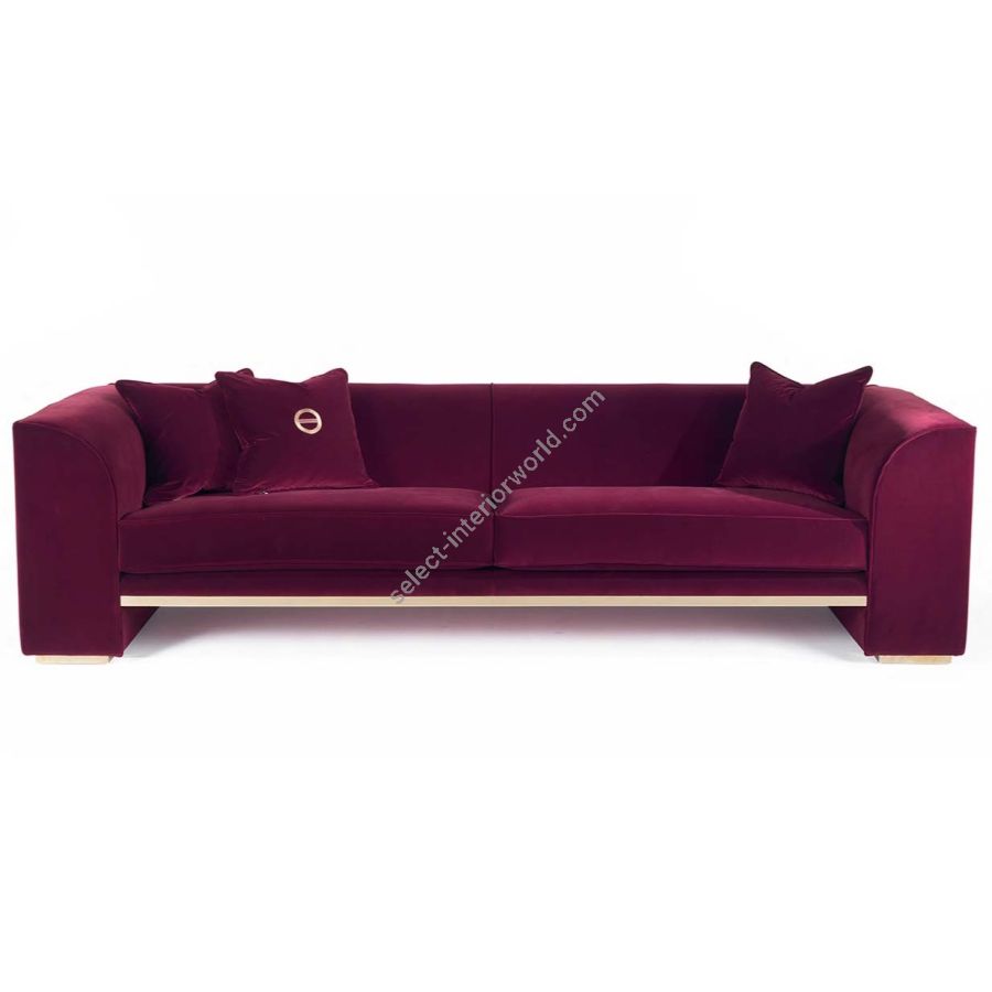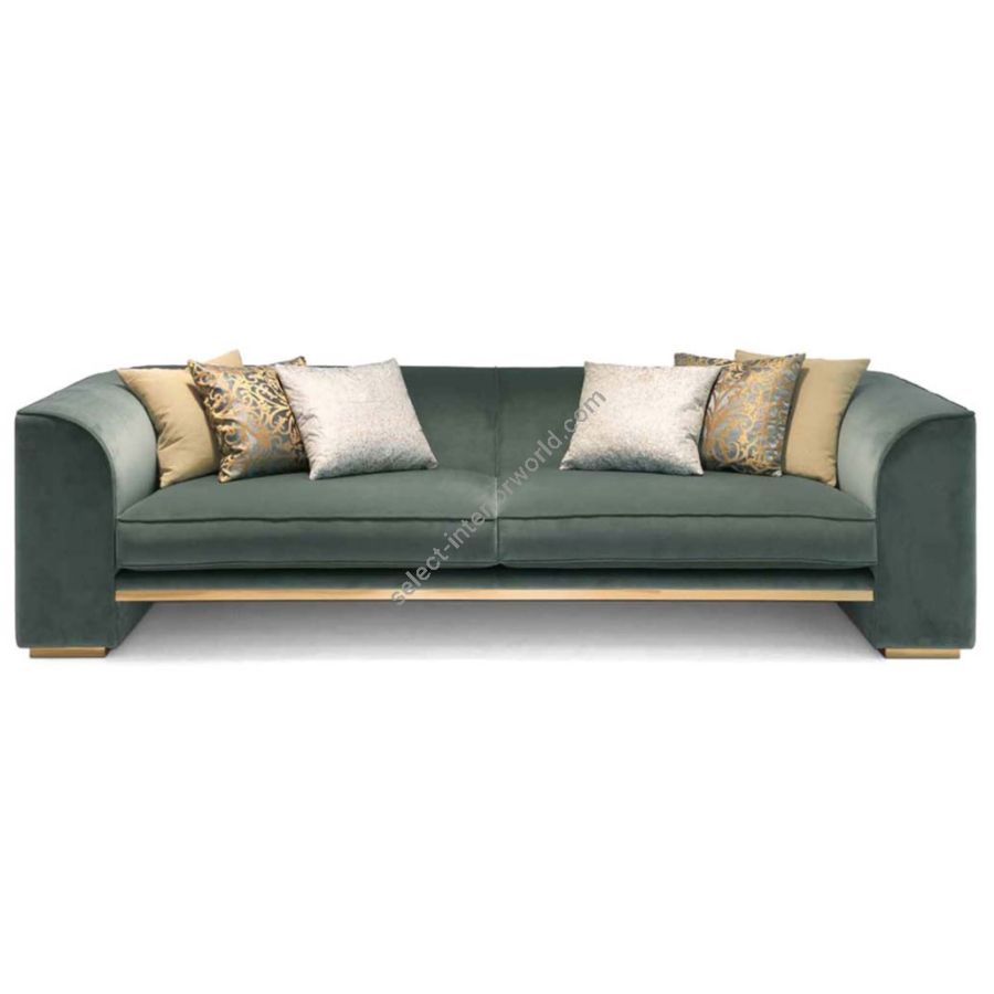 Contemporary style sofa with polished brass base, solid wood frame, non-deformable polyurethane foam padding with differentiated density, decorative feather cushions, seat cushion and backrest in goose down with non-deformable polyurethane foam insert.