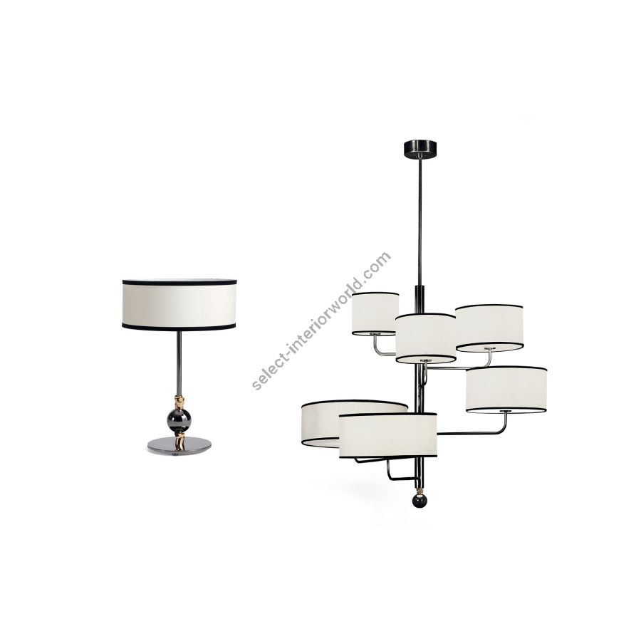 Modern style lamp set consisting of a table lamp and chandelier available in gold finish and black chrome finish, complete with ivory silk lampshade and velvet edge.