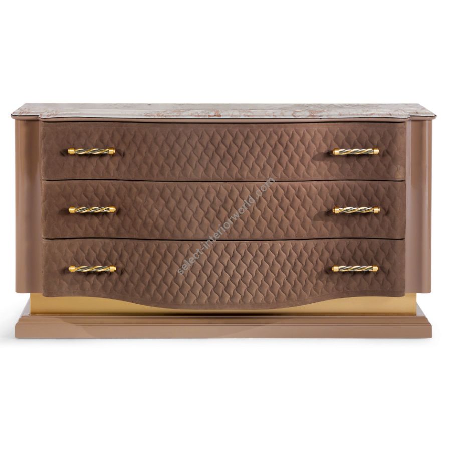Contemporary style chest of drawers with simple and sinuous lines, with a front characterized by elegant quilting and handles with precious finishes.