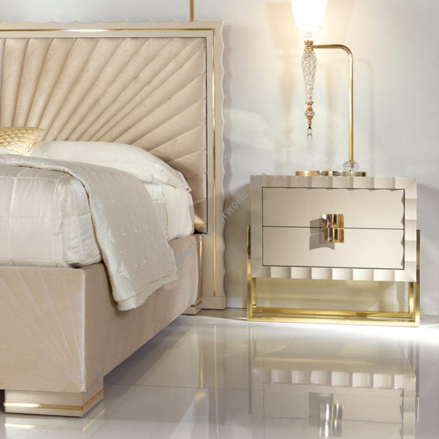 Elegant bedside table characterized by a lacquered surface, brass base and contemporary design. A sophisticated complement that is born from the long work of master craftsmen with decades of experience. The finely crafted front represents the unmistakable characteristic of this collection that combines simple lines with high quality artisan finishes.