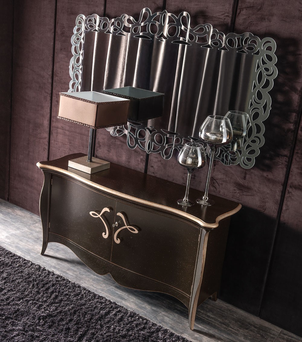 An important mirrorwith classic shapes characterized by the motif on the glass that reproduces a complex embroidery. Available in a natural, bronzed or smoked finish, the mirror surface is supported by a wooden panel that follows its empty lines, revealing the background on which it is hung. A piece of high manufacturing value, offering the greatest elegance and refinement to every interior.
