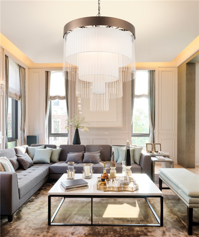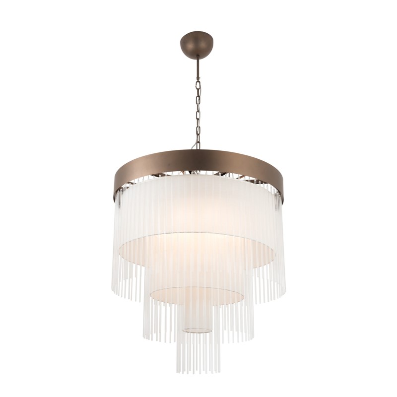 A pendant lamp with a fabric shade and clear glass straws in different sizes. A chandelier with contemporary design . Buy now!