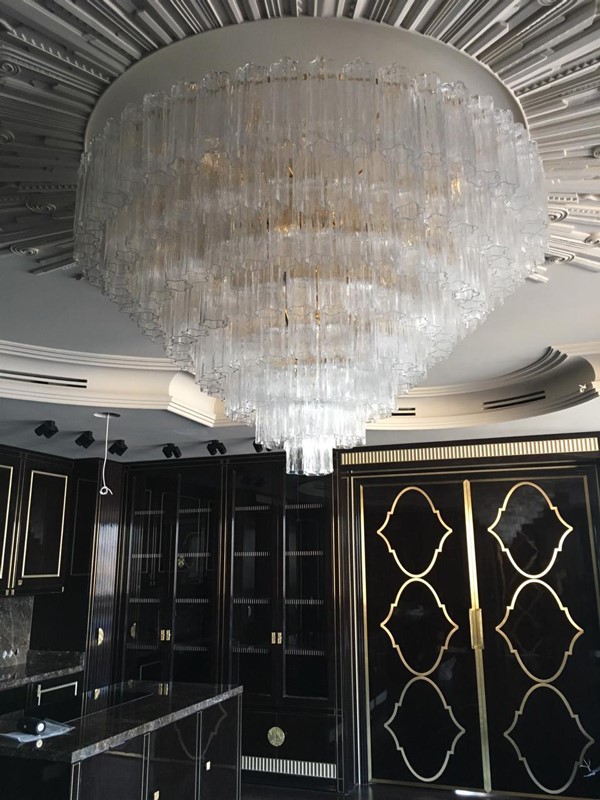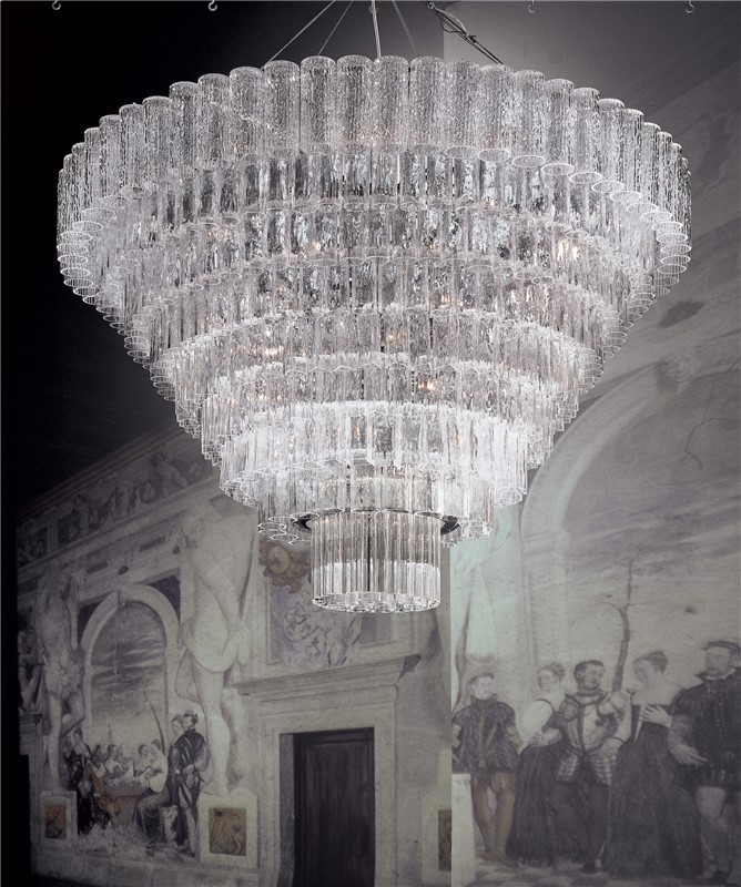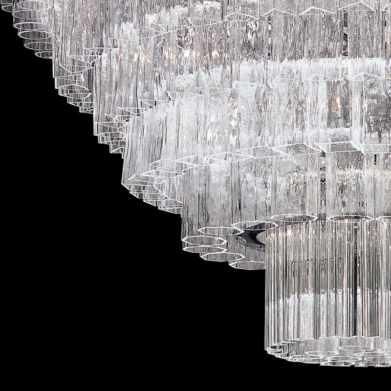 The decorative elements are tubes in hand-blown murano glass, in 5 different shapes and available in the following finishes: clear, amber, smoked and pink.