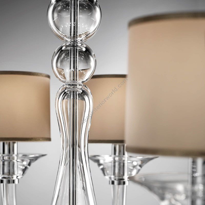 Chandelier in crystal, with metal in chrome finish, beige fabric shades.