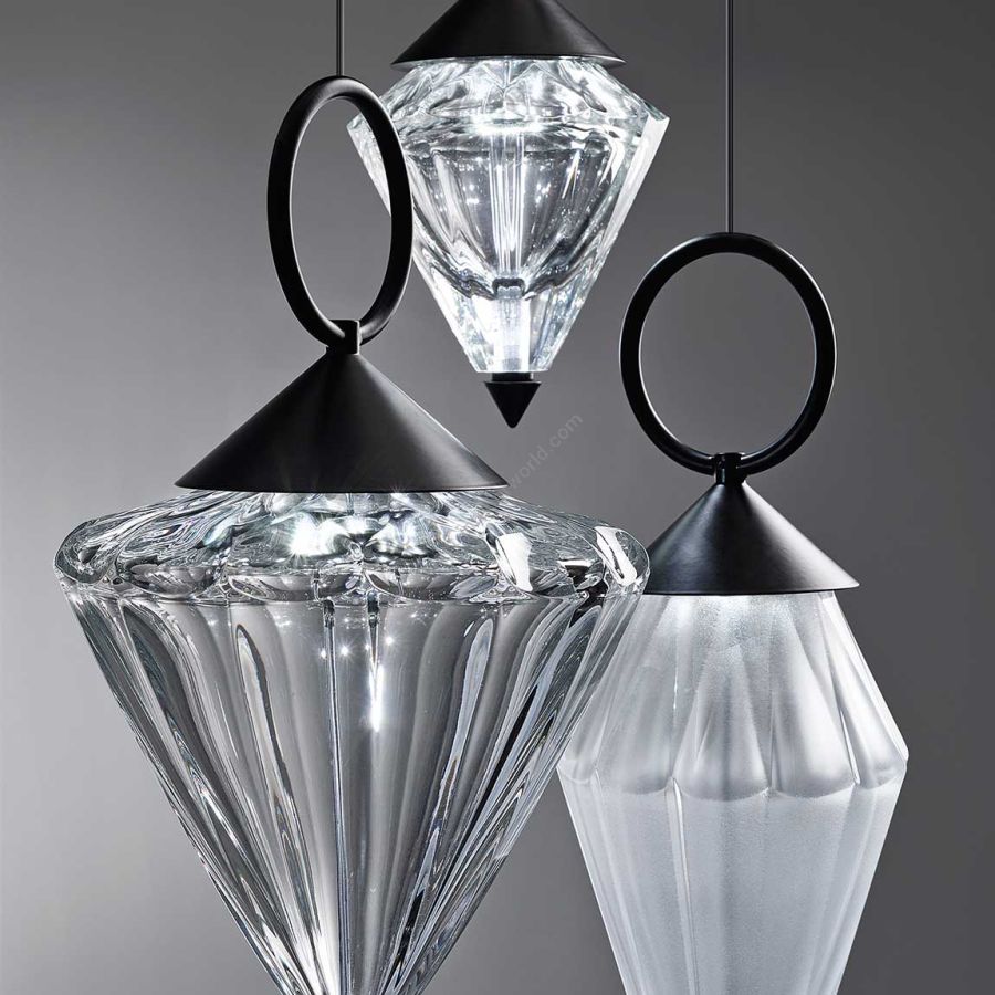 Pendant lamp with transparent and etched blown crystal diffuser. Metal structure with matte black, iron grey or light gold finishes.