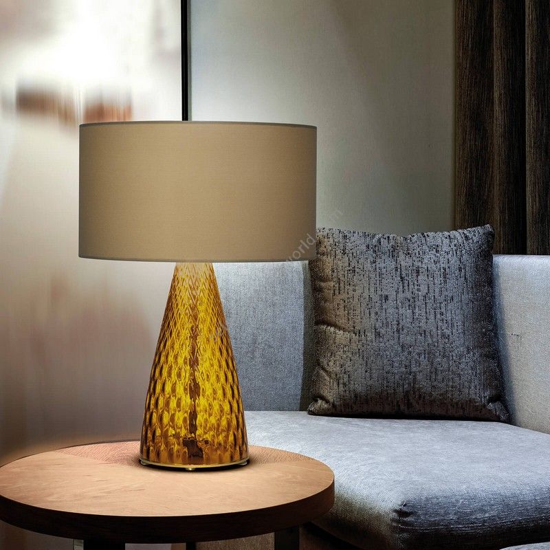 Table lamp in colored glass with hazelnut fabric shade and chrome finish details. Available in different dimensions and colours.
