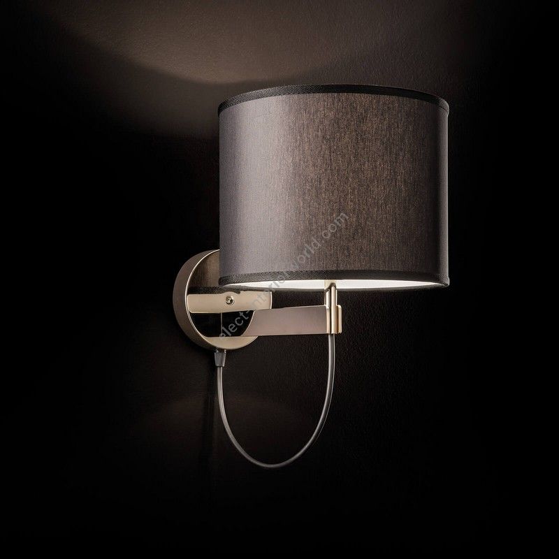 Wall lamp in metal with light gold finish and black fabric diffuser.
