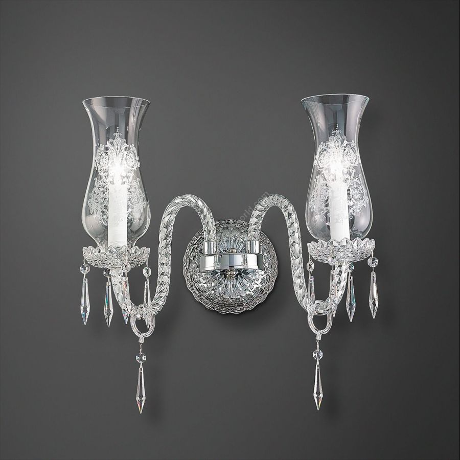 Wall lamp in carved crystal and glass, metal with chrome finish, glass diffusers and Swarovski Elements pendants.