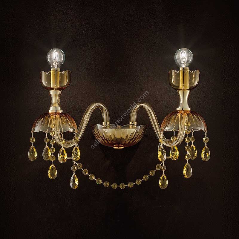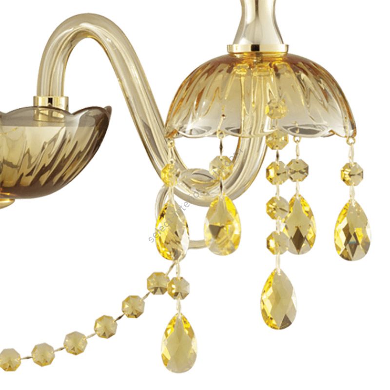 Wall lamp in amber carved crystal and glass, metal with gold finish, Swarovski elements pendants.