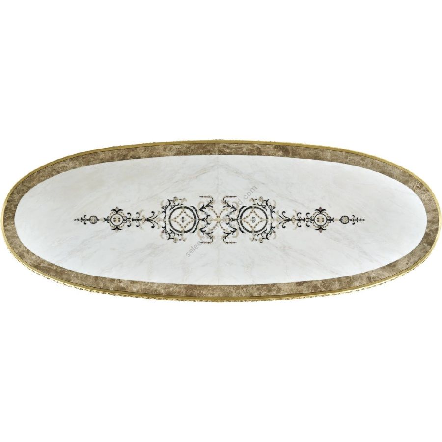 A statement piece of timeless grandeur, the Apollon dining table combines neoclassical elegance with refined craftsmanship. Its sculptural oval silhouette is crowned by a precious marble top, enhanced by inlays and wood trim that highlight its detailing. The base features majestic columns, richly carved and adorned with hand-applied gold leaf accents. The warm walnut and gold finish, along with the intricately sculpted wooden edge, add prestige to a table designed to elevate any formal dining space with distinction.