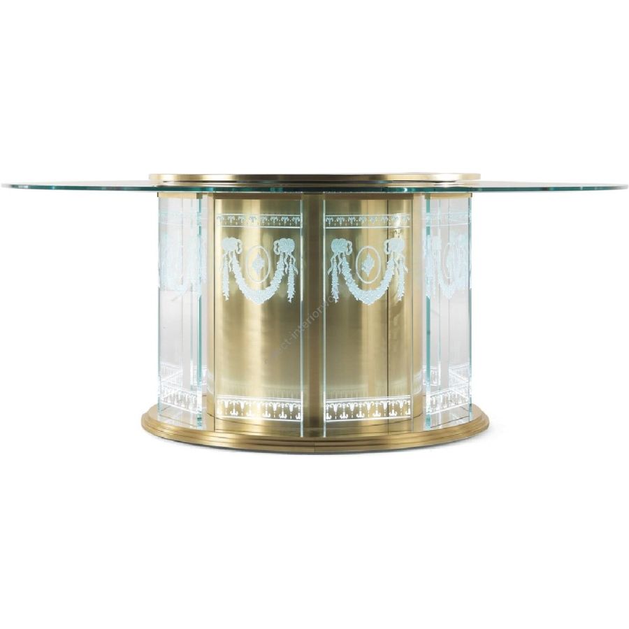 A scenographic dining table that demonstrates Jumbo Collections technical and artistic skills. The special manufacturing of the glass, engraved in several steps and with different depths, gives a three-dimensional effect to the drawings, studied ad hoc on the piece. The lighting takes place through the thickness of the glass and allows the engraved elements to be highlighted: bamboo, herons, peach blossoms and other elements inspired by the Orient.