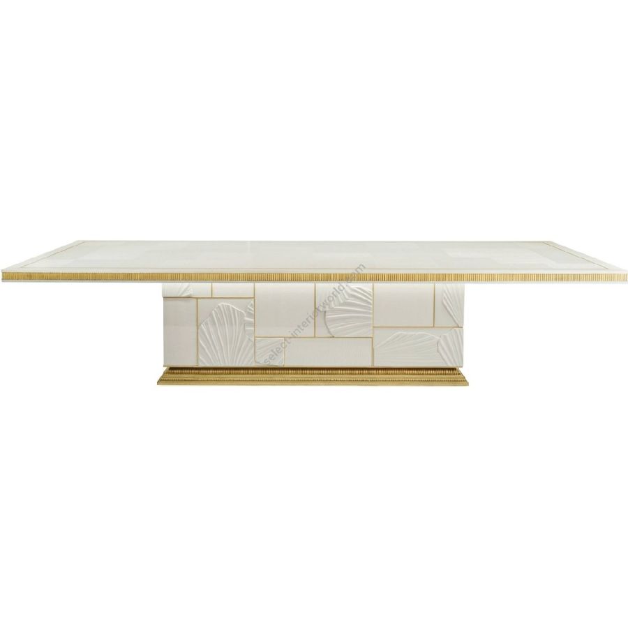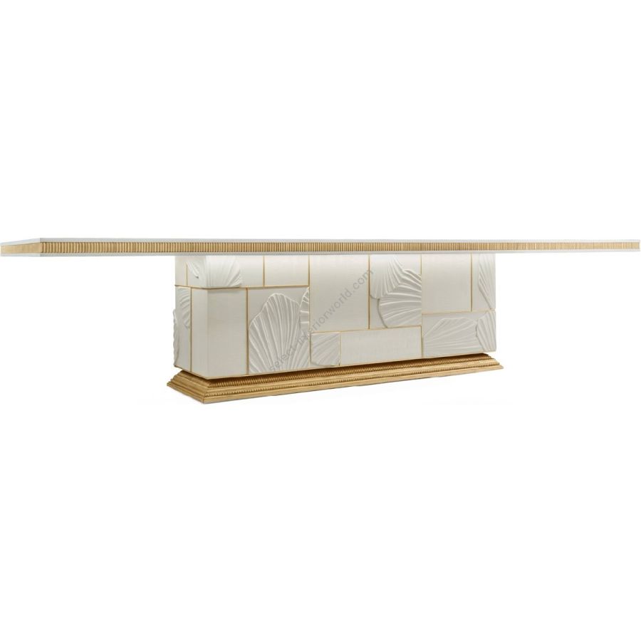 Nenuphar is a sculptural dining table, perfect protagonist of a classic and sophisticated dining room. A perfect expression of Jumbo Collection's eclectic decorative style, it stands out for the geometric shapes typical of Art Deco. Composed of a structure in white Tanganika wood and a top in the same material with patchwork inlay, the table is characterized by a base with ornamental decoration, reminiscent of water lilies evoked in its name.