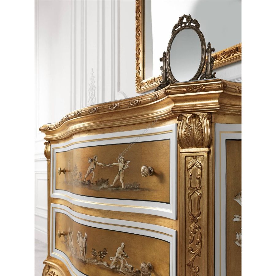 A line of furnishings in Baroque style, perfect expression of Jumbo Collection's decorative spirit and craftsmanship heritage. The chest of drawers is characterized by a beechwood structure with low-relief carvings finished in antique gold leaf with white and gold decorations inspired by neoclassical tradition, while the top is in precious onyx.