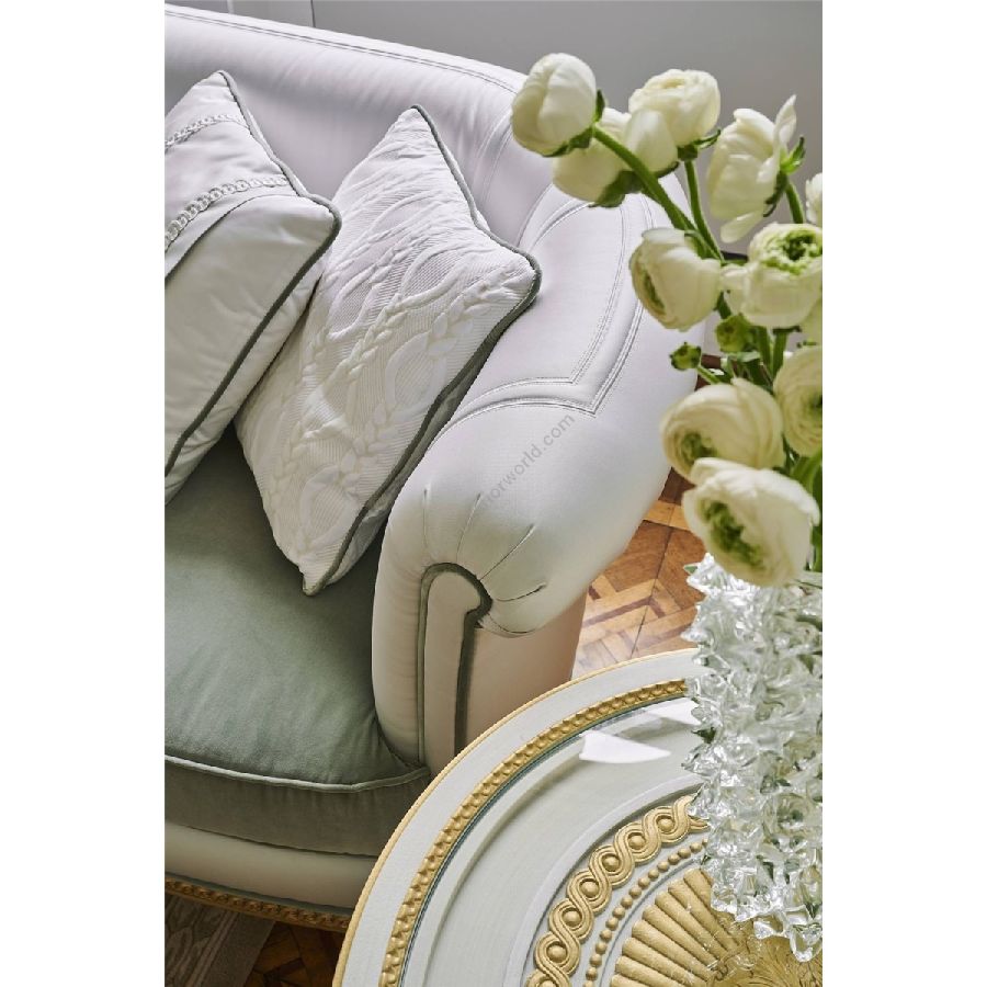 Expression of a fresh and luminous approach to classic style, the Ivy sofa is upholstered in refined fabrics in delicate tones and adorned with relief embroideries that enhance its elegance. The base, expertly hand-carved, is finished in antique gold with a grey patina. The sofa includes four cushions decorated with piping and embroidered edges, adding a touch of refinement. Ivy is a perfect example of timeless luxury and craftsmanship. A sofa that imbues any space with its distinctive presence.