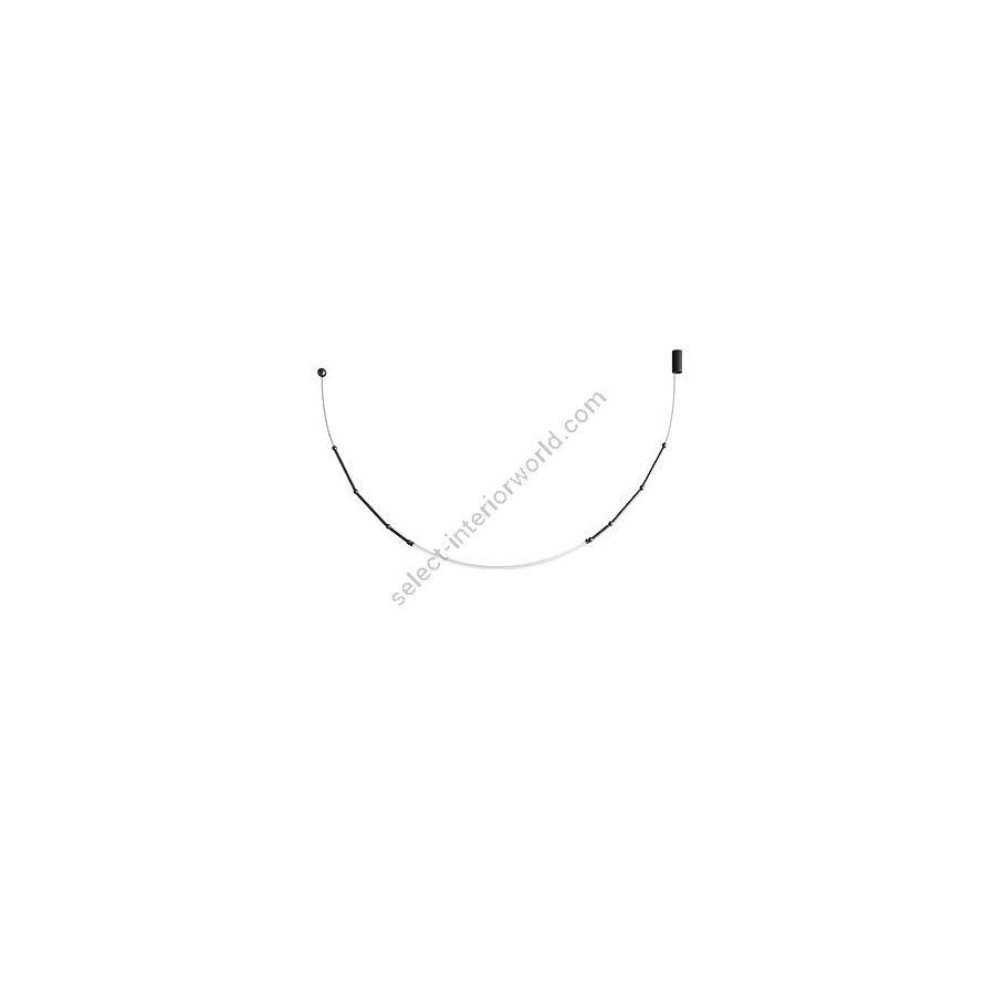 The lamps in this collection alternate between cylindrical bars and small spheres of anodized bronze or black aluminum, arranged like pearls in a ring on a wire supporting LEDs encased in a transparent, flexible silicone tube.