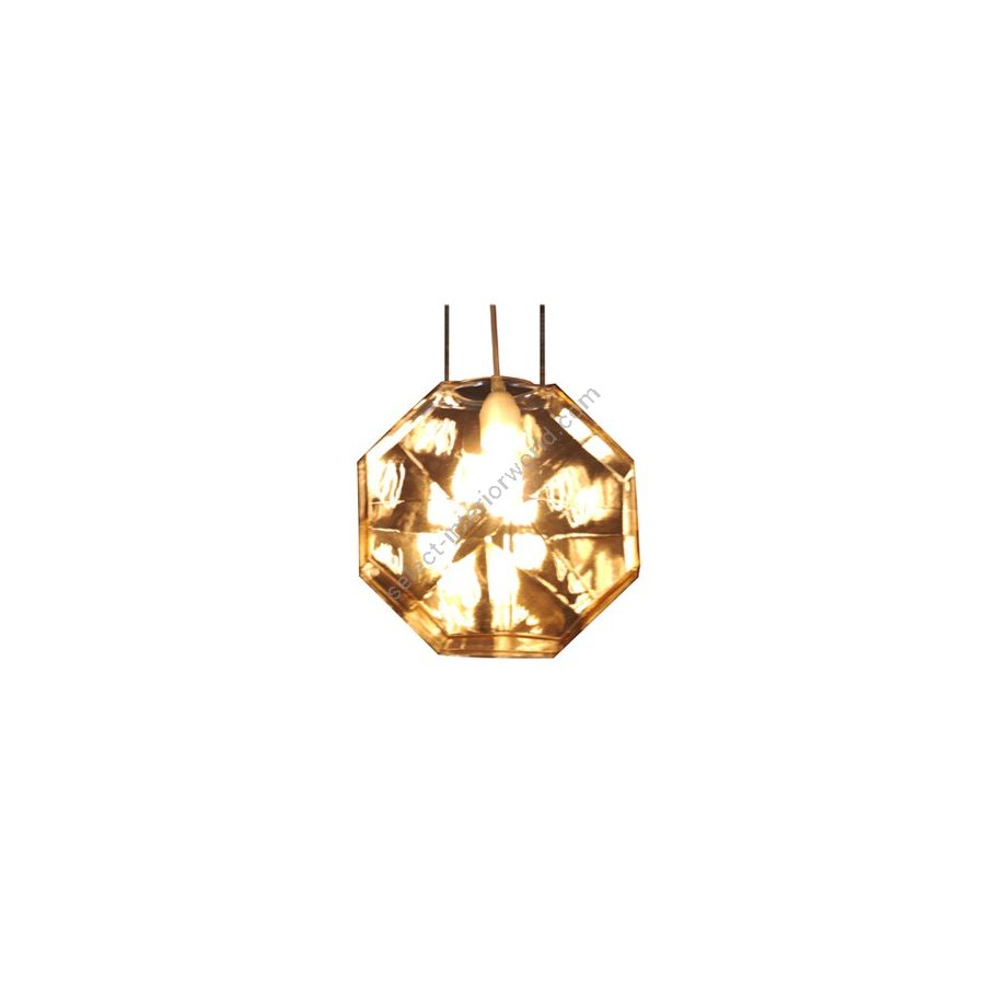 With the skillful craftsmanship of smoked or pale yellor glass to replicte the cut of gemstones, 24 Karati sparkling suspensions are available in drop or hexagonal shapes. This unique combination of three-dimensional shapes,which not only reflect light but also glow, can be enjoyed on their own or in clusters.