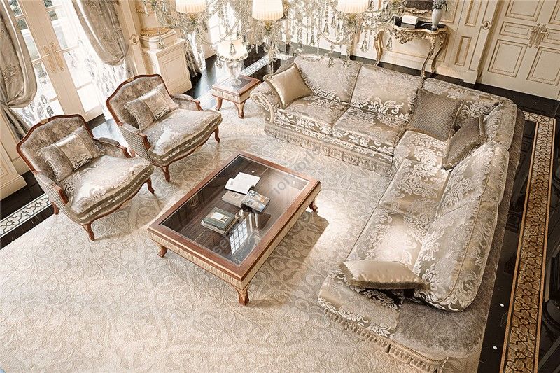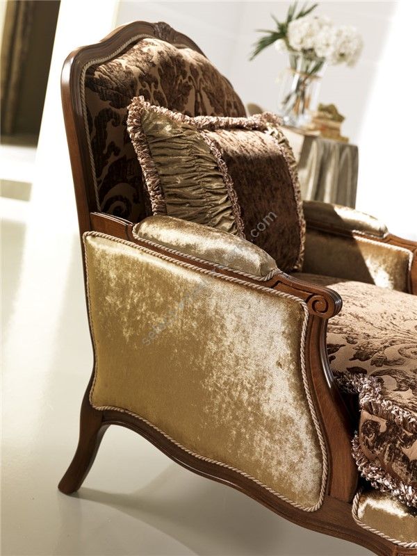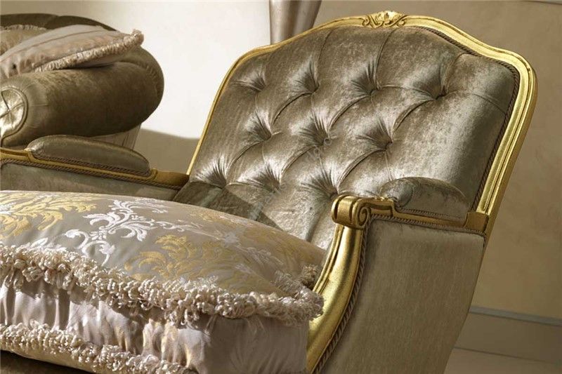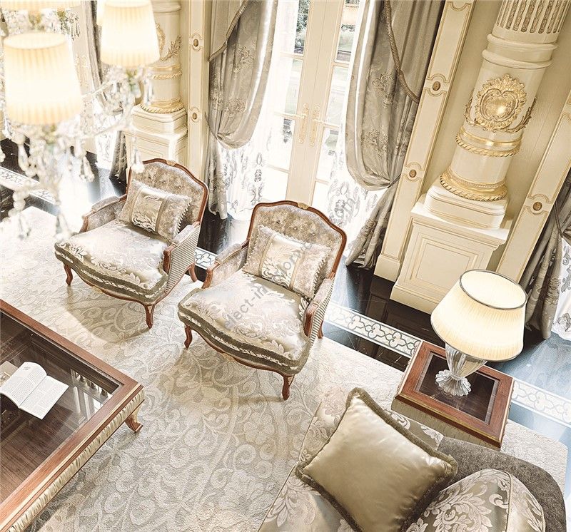 Technical description Armchair with a semiremovable seat covering. Beechwood structure with hand-carved parts. Non-deformable polyurethane foam cuschion. Pillows with goose feathers. Golden, silver or copper leaf is available upon request at extra charge. Data sheet