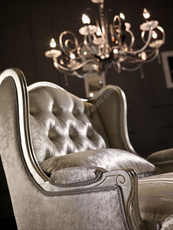 Hand-finished beechwood structure. Non-deformable polyurethane foam cushion. Seat and backrest cushions with goose feathers. Golden, silver or copper leaf is available upon request at extra charge. An additional price is to be paid for the capitonné upholstery buttoning model as indicated in the price list.